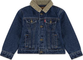 This iconic trucker jacket made of dark denim is updated with a quilted lining and soft corduroy collar for comfy warmth.