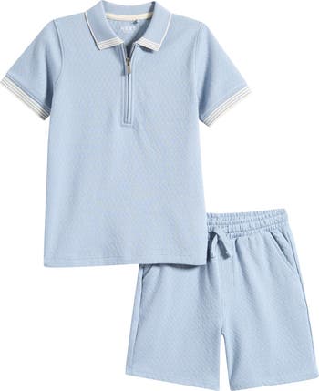 A textured knit and narrow tipping stripes at the rib collar and cuffs bring sporty style to this cotton-blend knit polo and shorts set that will bring your little one comfort all day long.