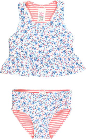 Your little one will look adorable splashing in this reversible two-piece featuring a ruffled tankini top and coordinating bottoms.