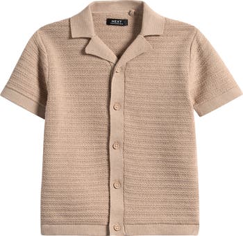 A textured knit lends crochet-inspired dimension to this cotton-blend button-up shirt made with a notched collar that brings casual flair to your kiddo's look.