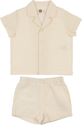 Perfectly rumpled cotton-blend seersucker invites breezy, sunny-day comfort in a camp shirt and matching shorts sized for kids who like to look dapper when the weather is warm. They work well as a set and mix/match easily with other casual favorites for expanding your child's wardrobe without blowing up your budget.