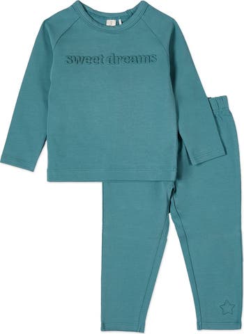 It's all about cozy comfort with this charming pajama set. The cute crewneck top boasts a fun "Sweet Dreams" message, embossed for a 3D effect. Matching bottoms have a covered elastic waist for freedom at every turn. Both pieces come in stretch-cotton fleece, brushed inside for blissful softness.
