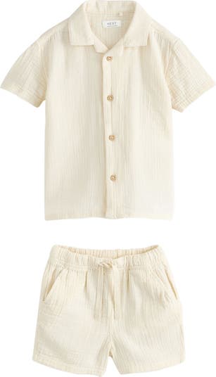 Your tiny trendsetter can take on warm-weather parties in the fresh, breathable comfort of this cotton-gauze set featuring a classic camp shirt and a pair of matching shorts.