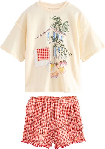 An appliquéd and embroidered graphic design evokes sunny vacations in an oversized cotton T-shirt that's paired with ruffly shirred gingham shorts.