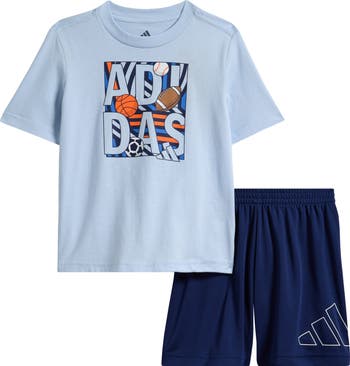 Logo art celebrating a range of popular sports brightens a kids' all-cotton T-shirt that pairs with coordinating athletic shorts made of recycled fibers to keep your child playing and relaxing in smart comfort. They work great together and pair easily with other favorite clothes for changing up a look without kicking up your budget.