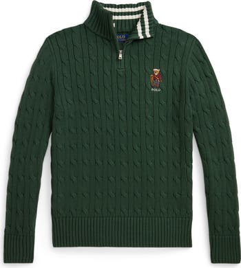 The brand's bear motif is embroidered on the chest of a cable-stitched quarter-zip pullover that brings a preppy finishing touch to classroom days and weekend adventures.