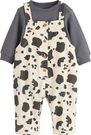 For a look that milks your kiddo's cuteness for all its worth, consider a set that includes cow-printed corduroy overalls and a soft stretch-cotton bodysuit that snaps between the legs for diaper-changing ease.