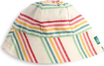 Rainbow-hued stripes brighten a kid-sized bucket hat shaped from organic cotton and perfect for keeping them covered during sunny-day adventures.