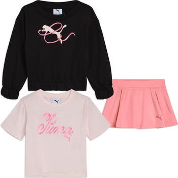 Your sporty kid will be ready to play or practice in this comfort of this logo-marked skort, sweatshirt and graphic T-shirt set.