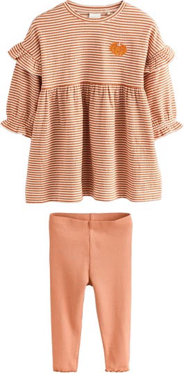 A cheerful pumpkin adorns a sweet striped dress that your little one can pair with comfy leggings, both made from stretch-kissed cotton.