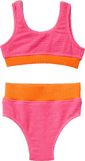 They'll love the neon colorblocking on this two-piece swimsuit made of crinkled fabric that has lots of stretch.