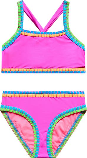 Blanket-stitch embroidery and contrast piping outline this two-piece swimsuit made from a quick-drying fabric that keeps them feeling comfortable as they splash in the water.