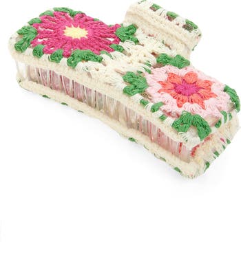 Crocheted flowers add garden-fresh charm to this claw clip designed to secure your kiddos tresses neatly in place.