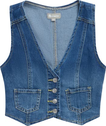 They'll love to layer their look in this nonstretch denim vest made with front patch pockets and a notched hem.