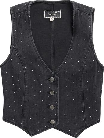 Princess seams shape a cotton-blend denim vest that shimmers from every angle with tiny crystals for a look your child will love.