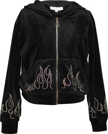 Multi-hued crystal flames dance on a zip-up hoodie made from cushy velour and sure to appeal to your fashion-forward child.