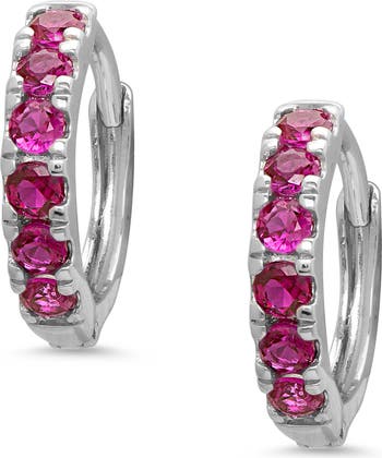 Pretty pink cubic zirconia line these petite hoop earrings your little one is sure to take a shine to.