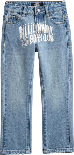 Front logo graphics and embroidered back patch pockets bring big brand energy to these cool, kid-size jeans cut from nonstretch denim.