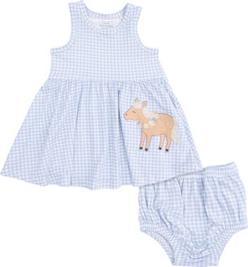 An allover gingham print and animal appliqué enhance the charm of this sleeveless dress and matching bloomers set.