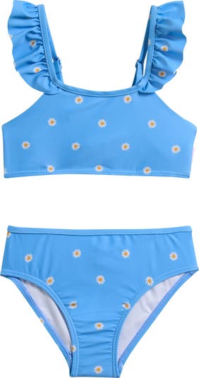 Bring a little retro flair to their pool days with this two-piece swimsuit splashed with a daisy print and accented with ruffles.