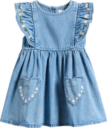 Cheery daisy embroidery adorns the ruffled cap sleeves and adorable heart-shaped pockets on this cotton denim dress your little one will wear everywhere.