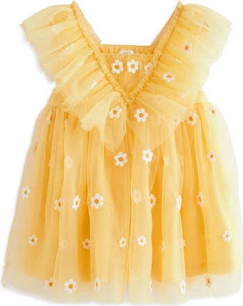 Kids can embrace the sunshine in this floaty, layered mesh dress sweetened with a ruffled neckline and daisy embroidery.