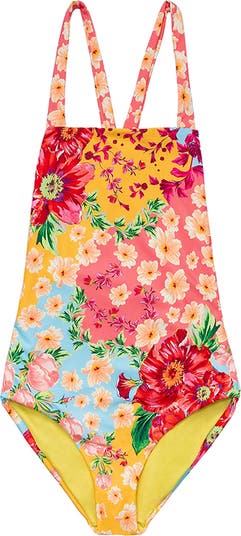 Adjustable button straps and a back tie offer your kiddo a most comfortable fit in this adorable one-piece covered in a blooming floral print.