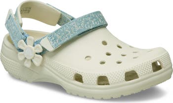 A denim-textured strap and sweet flower accent refresh this classic clog crafted from lightweight Croslite® and finished with an adjustable heel strap for a secure, play-ready fit.