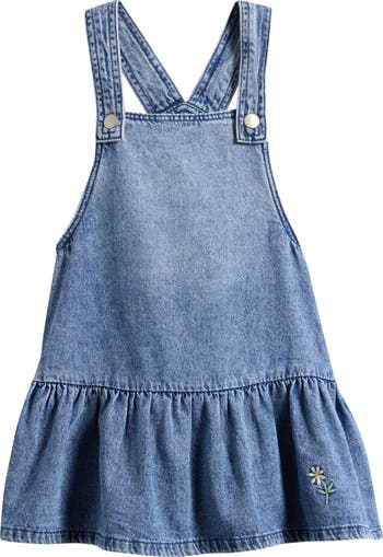Your little one will look picture-perfect in this playful denim pinafore dress featuring a swingy hem finished with a delicate embroidered flower.