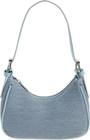 Smooth faux-leather trims highlight the denim exterior of a kid-approved shoulder bag suspended from an adjustable strap perfect for their daily adventures.
