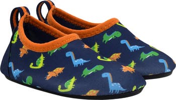 An elastic cuff and nonslip sole keep little feet sturdy and comfortable in dino-print stretch-knit shoe finished with a foam-cushioned footbed.