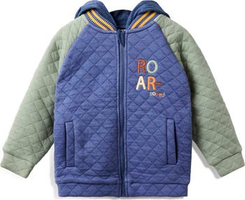 Dinosaur appliqués put a playful, prehistoric spin on this diamond-quilted bomber jacket topped with a cozy hood.