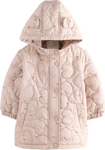 Cozy quilting in a heart design looks darling on a zip-up jacket featuring a roomy hood topped with animal ears—just for fun.