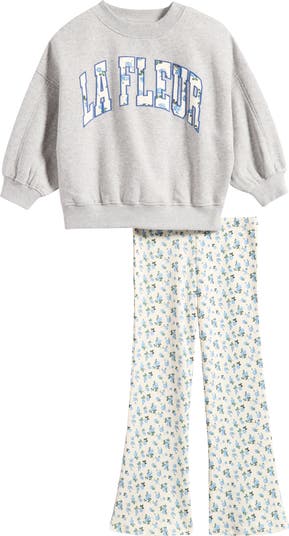 A floral print sweetens this varsity-inspired set that pairs a comfy sweatshirt with flare leggings to give your kid a complete school-day ready look.