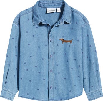 A happy hound marks the chest of a delightful denim shirt designed with adjustable button cuffs to grow with your kiddo.