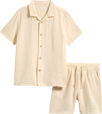 Keep your little one cute and coordinated in this button-up shirt and shorts set made from double-cloth cotton.