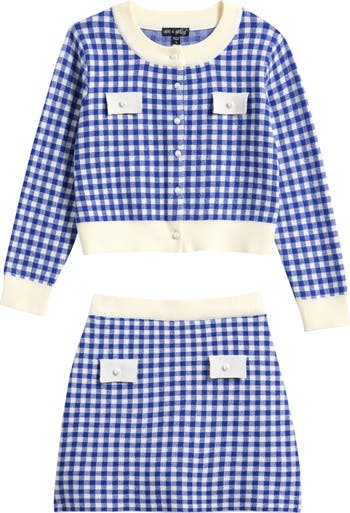 Adorable checks sweeten this cardigan and skirt that can be worn together or mixed and matched with other pieces.