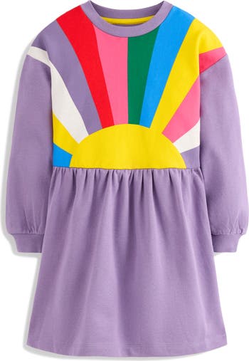 Rainbow rays brighten the bodice of a charming sweatshirt-style dress cut from soft cotton that will keep your child comfy and ready for play.