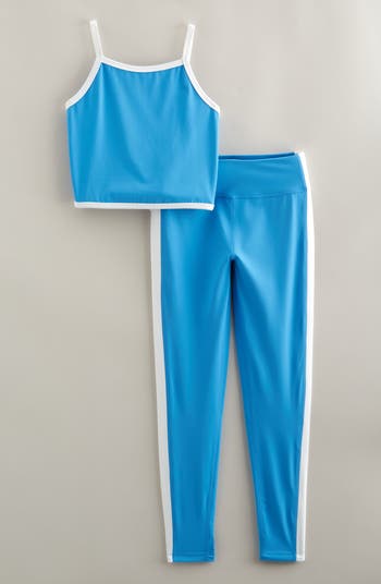 Contrast trim and side stripes extend the sporty appeal of this two-piece set featuring a trendy cropped tank and coordinating leggings.