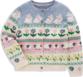 Intarsia-knit bunnies, flowers and sheep grace this adorable, kid-size cardigan knit with plenty of wool for cozy warmth.