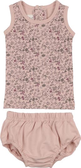 A delicate floral print brings graceful charm to a soft cotton-blend top that's paired with coordinating bubble bloomers.