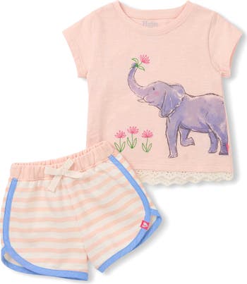 Warm weather calls for this eyelet-trimmed T-shirt and striped shorts set that will have your little one cute and comfortable in pure cotton.