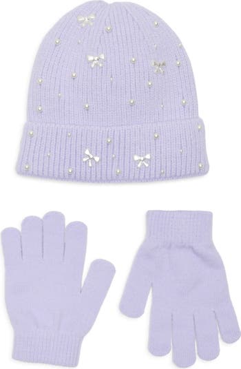 Cold days just got cuter and warmer with this pearly embellished beanie and coordinating gloves set in their collection.