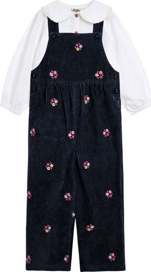 Colorful embroidered flowers decorate corduroy overalls paired with a darling button-up shirt sweet enough for special occasions and comfy enough for everyday.