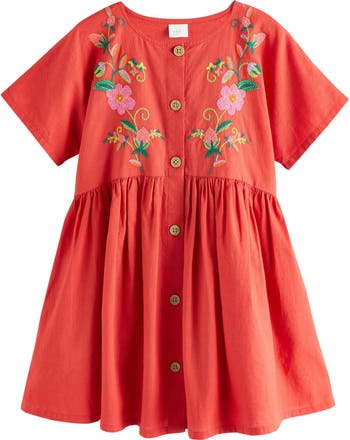 Buttons secure the front of this embroidered dress made of lightweight cotton that keeps your kiddo feeling breezy.