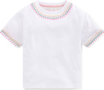 Colorful embroidery trims this breathable cotton T-shirt that they'll love to wear on repeat.