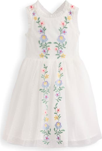 They'll be looking fresh and feeling special in this dotted tulle dress featuring embroidered blooms and ruffle-trimmed crisscross straps.