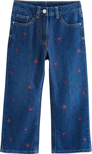 Darling embroidered hearts and flowers pattern comfy flare-leg jeans your child will love. An adjustable interior waistband allows you to get the perfect fit as your child grows.