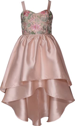 They'll be ready to twirl in this standout party dress featuring an embroidered, structured bodice and a contrasting mikado skirt with a high-low hem.