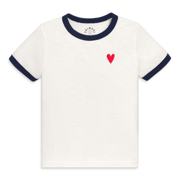 Not *not* inspired by our own childhood wardrobes. It’s the classic ringer tee kids love, with a pop of heart embroidery on the chest. Made from 100% cotton slub that is pre-washed to minimize shrinkage. This shirt feels soft with a light and laidback texture. Machine wash cold, tumble dry low.